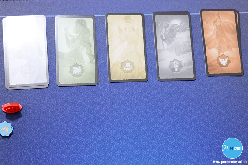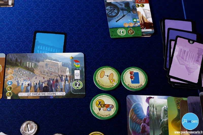 Comme je le disais, le jeu se déroule de la même manière que le jeu de base, mais avec les modifications apportées par l’extension. Lorsqu’un joueur doit retourner une carte de la structure Âge (ou plusieurs), si un jeton « Mythologie » ou « Offrande » est dessus, il doit dans un premier temps placer ce jeton devant lui.