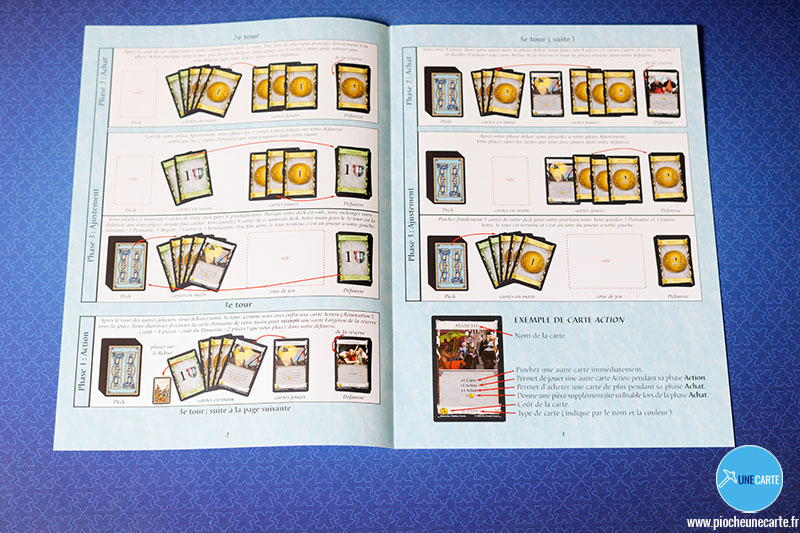 Et les deux autres éléments, c’est d’une part, le livret de règles ainsi qu’un second livret qui nous montre un exemple de partie. Ce que j’aime bien dans le livret de règles, c’est qu’on a d’un côté, les règles complètes et sur la droite, dans une colonne, le résumé des règles pour aller plus vite.