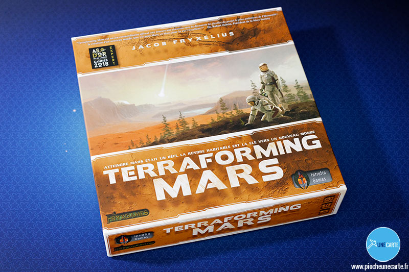 Dès la face avant de la boîte, nous savons où nous allons, enfin presque ! Une chose est sûre, nous allons sur Mars ! Sur cette première face, nous avons deux scientifiques en combinaison qui sont en train d’étudier la planète rouge ! Cela donne le ton ! Ensuite, on retrouve le nom du jeu écrit en gros, en bas au centre de la boîte et le nom de son auteur, en haut au centre de cette dernière. Tout en bas à droite, on peut voir le logo de Intrafin Games, mais aussi en bas à gauche, celui de l’éditeur Fryxgames ! Et bonne nouvelle, une mention qui nous indique que Terraforming Mars a remporté l’As d’Or 2018 du jeu de la catégorie « Expert » !