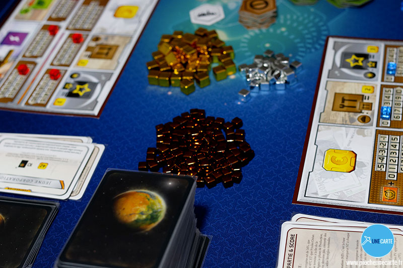 Combien de fois un cube indiquant la quantité de ressources générées à chaque tour se retrouve autre part par un simple coup de coude, un mouvement de table ou une inadvertance de la part du joueur, en piochant les cartes de début de tour. C’est dommage, même si je sais que des plateaux existent pour ce titre, mais c’est un budget supplémentaire à accorder.