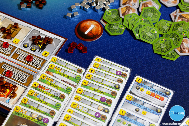 On peut voir aussi ce que représentent l’acier et le titane en « MégaCrédits », le coût de transformation en plante pour construire une forêt et la chaleur nécessaire pour augmenter la température de Mars.