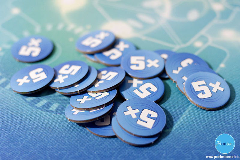 Il y a cependant, en plus des règles que l’on va vous présenter un peu plus bas, des règles générales à appliquer ! Dès que l’on gagne des points de Victoire ou qu’on en perd, il faudra déplacer son pion sur la piste des scores. Toute dépense de ressources retournera dans la réserve générale. Les ressources concernent le minerai et l’énergie lorsqu’on y fait référence. Concernant les jetons x5, si vous manquez de ressources, il suffira de placer celle-ci dessus pour indiquer que cela représente 5 ressources de ce type.